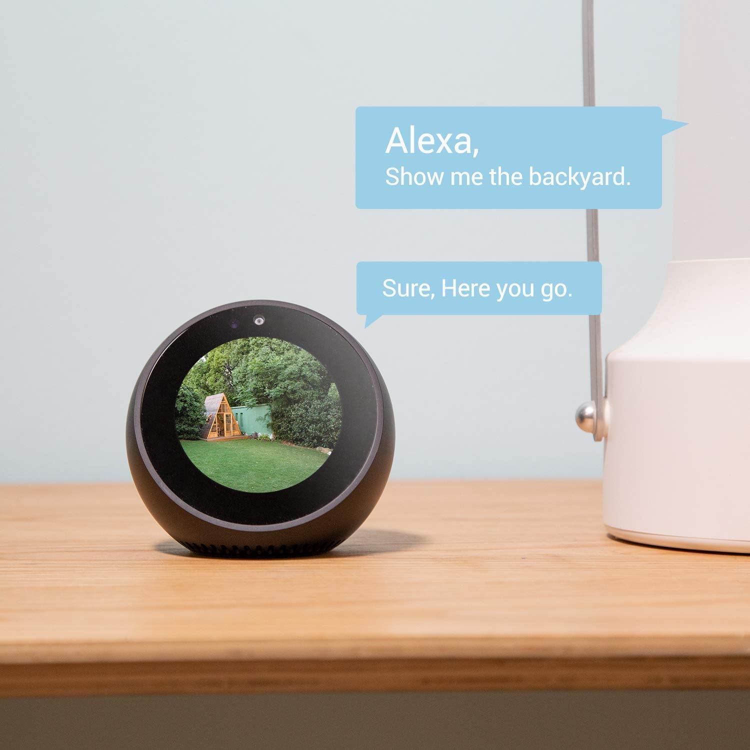 Diseño redondo y compacto con carcasa en blanco y negro, resistente a la intemperie.