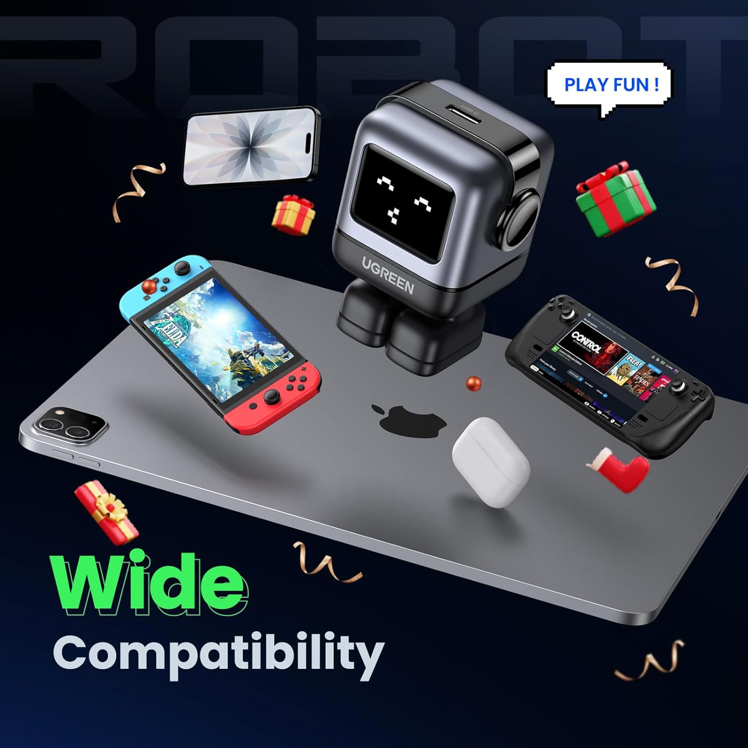 ¿Aburrido de los mismos cargadores blancos? Dale una "monada extrema" y un toque de personalidad a tu escritorio con el UGREEN Nexode GaNRobot. No es solo un cargador, es un compañero de carga con un diseño de robot único que cobra vida para potenciar tus dispositivos. Este cargador tiene personalidad. Su minipantalla LED inteligente muestra una simpática expresión que te indica el estado de la carga en tiempo real. Sabrás de un vistazo si tu dispositivo está cargando ( ^_^ ) o si ya está al 100% ( O_O ), pero no dejes que su adorable diseño te engañe. En su interior late la última tecnología GaNFast. Entrega 30W de potencia PD, capaz de cargar tu iPhone 15 Pro Max al 51% en solo 30 minutos. Carga rápida en un instante.